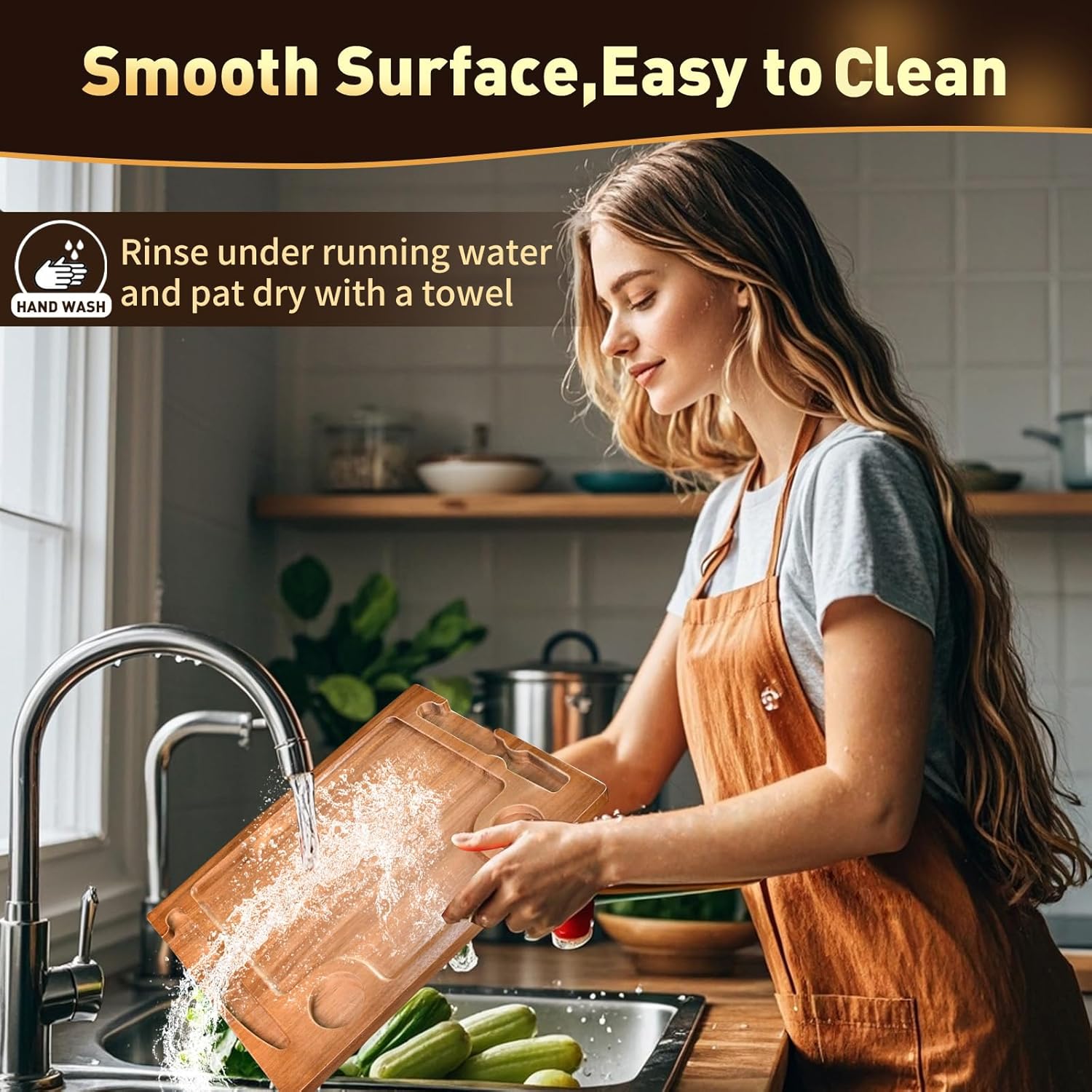 【Reversible Acacia Wood Cutting Board–Knife-Friendly & Dual-use】Crafted from thick, naturally durable acacia wood that protects knife edges and prevents cracking. Each wood charcuterie boards is designed for double-sided uses: Cut and prep on the cutting board side and flip to be served as a steak board for cooked meats. Offering a delicate and long-lasting addition to your kitchen or dining table.