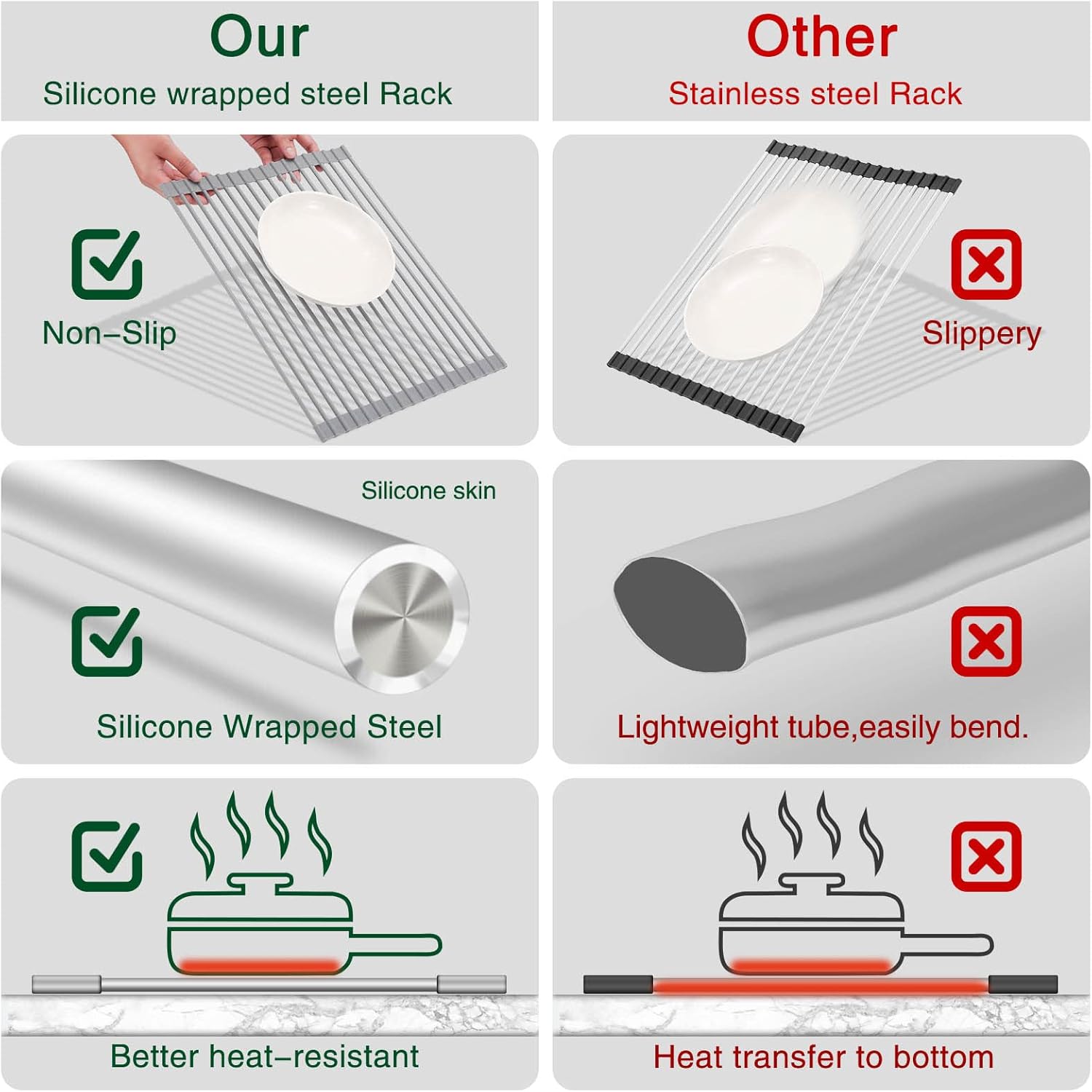 ✔️ HEAT RESISTANT AND DURABLE: Made of high-quality 18 bars that are coated with silicone, Heat resistant up to 400°F (204°C),Resistant to rust, non-slip, durable, glassware friendly,and sturdier than stainless steel racks.Oil-resistant, very easy to clean. Collapsible, and rolls up for easy storage.
