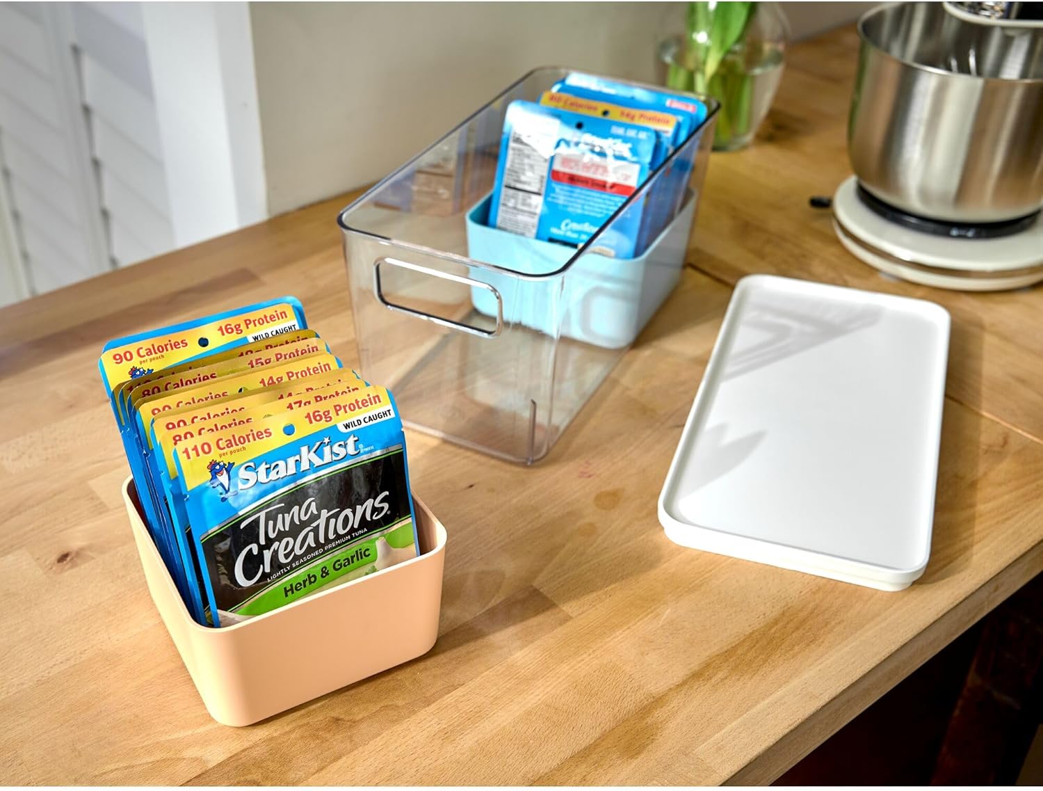 MULTIPLE BINS – This set of kitchen and pantry organizers includes 2 medium storage bins that nestle inside a larger bin. The large bin includes a lid to keep ingredients fresh for effortless kitchen organization.