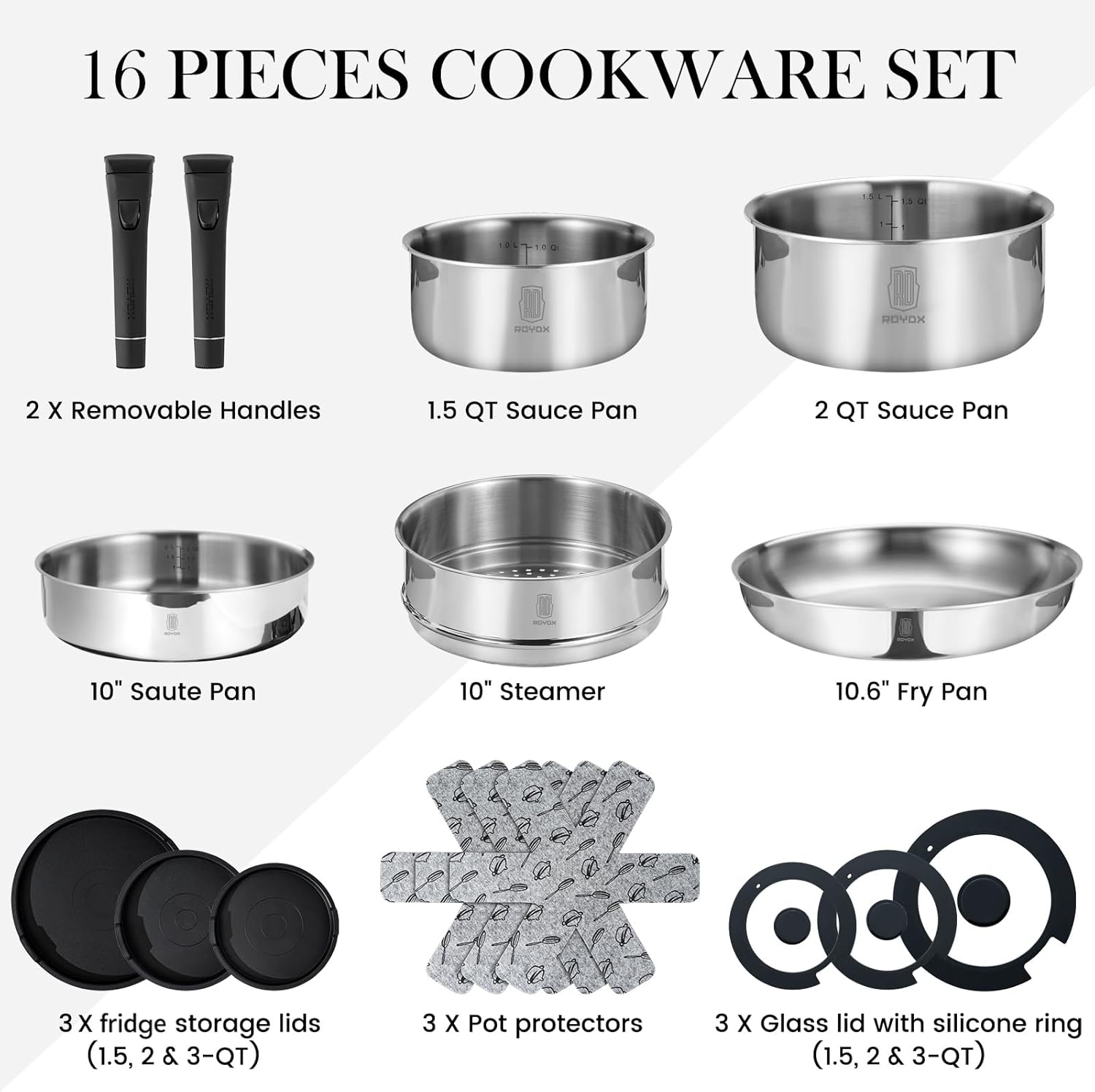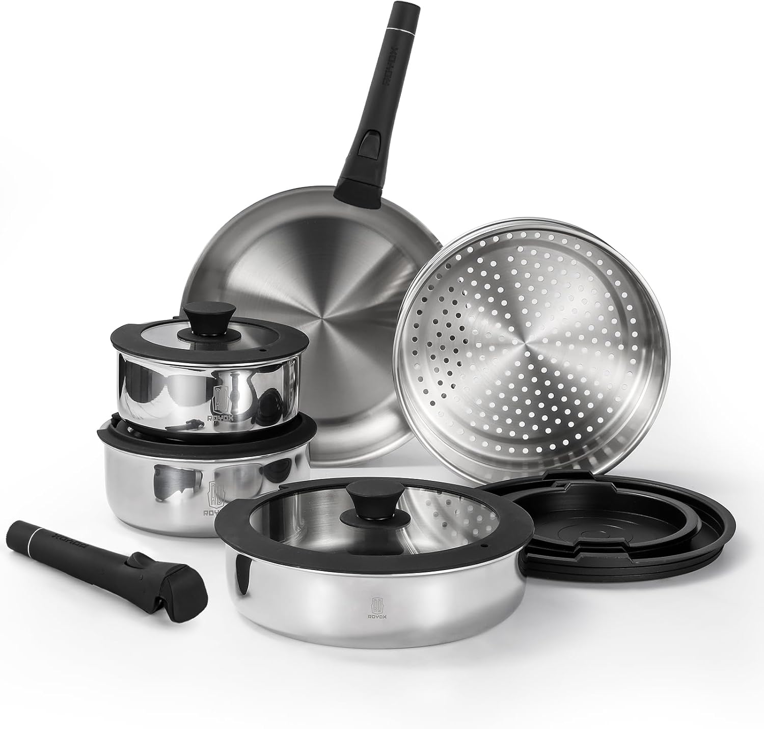 【Why Choose ROYDX Stainless Steel Cookware Set】Flavor preservation. Heat transfer. Durability. Strength. Hygienic.