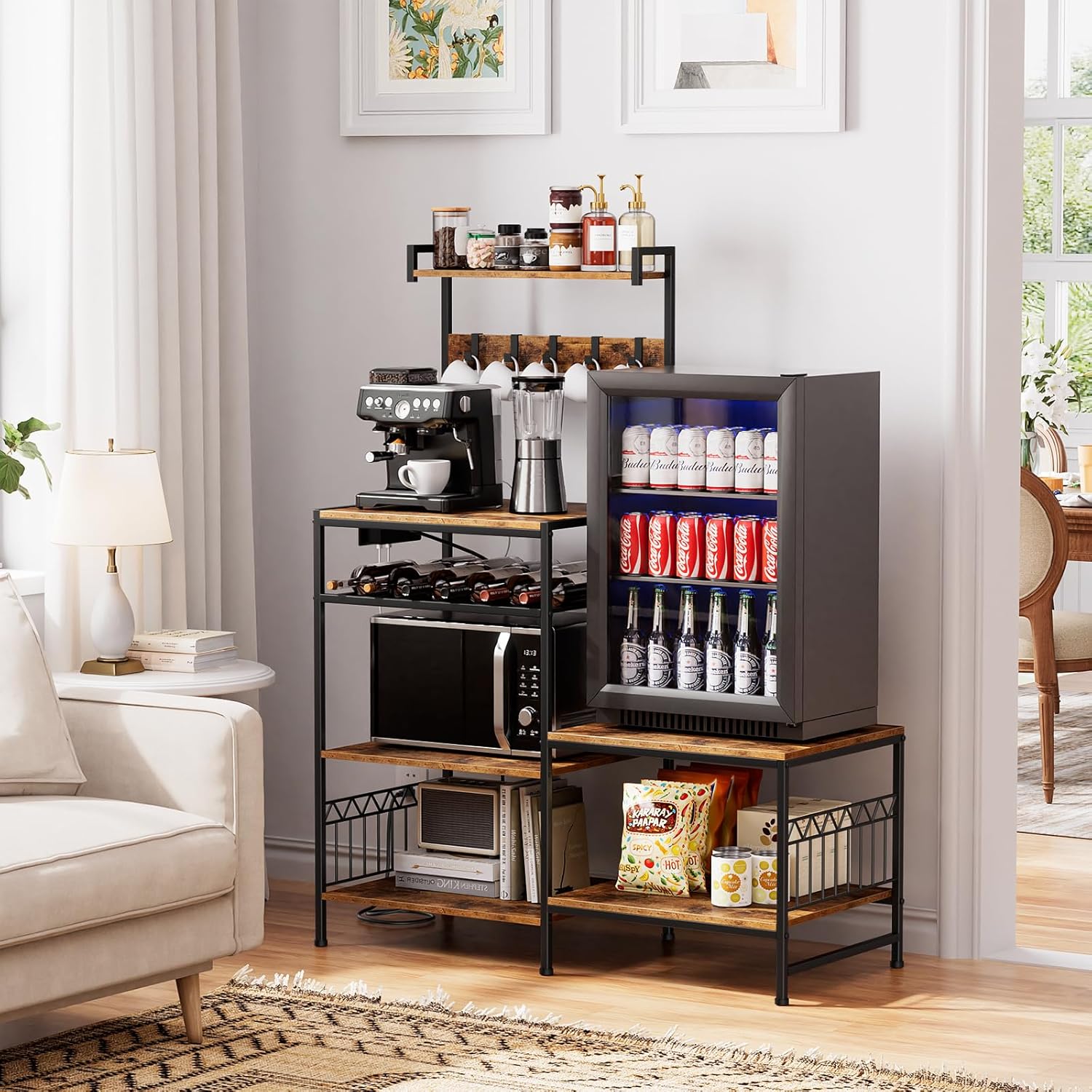 Master of Space Utilization – Portin multi-functional kitchen shelves bakers rack with power outlet provides great space for your coffee maker, spices, pots and pans, mini fridge, microwave oven, fryer, wine, beverages and a variety of kitchen stuff and devices.
