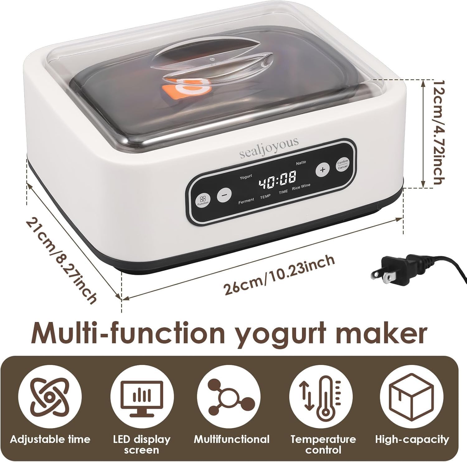 Elevate your culinary experience with our state-of-the-art yogurt maker. Crafted from premium 304 stainless steel, this appliance boasts an adjustable temperature range of 21°C-45°C and a generous 1.6-quart capacity. The intuitive LED display ensures precise control, allowing you to create delectable homemade yogurt with ease.