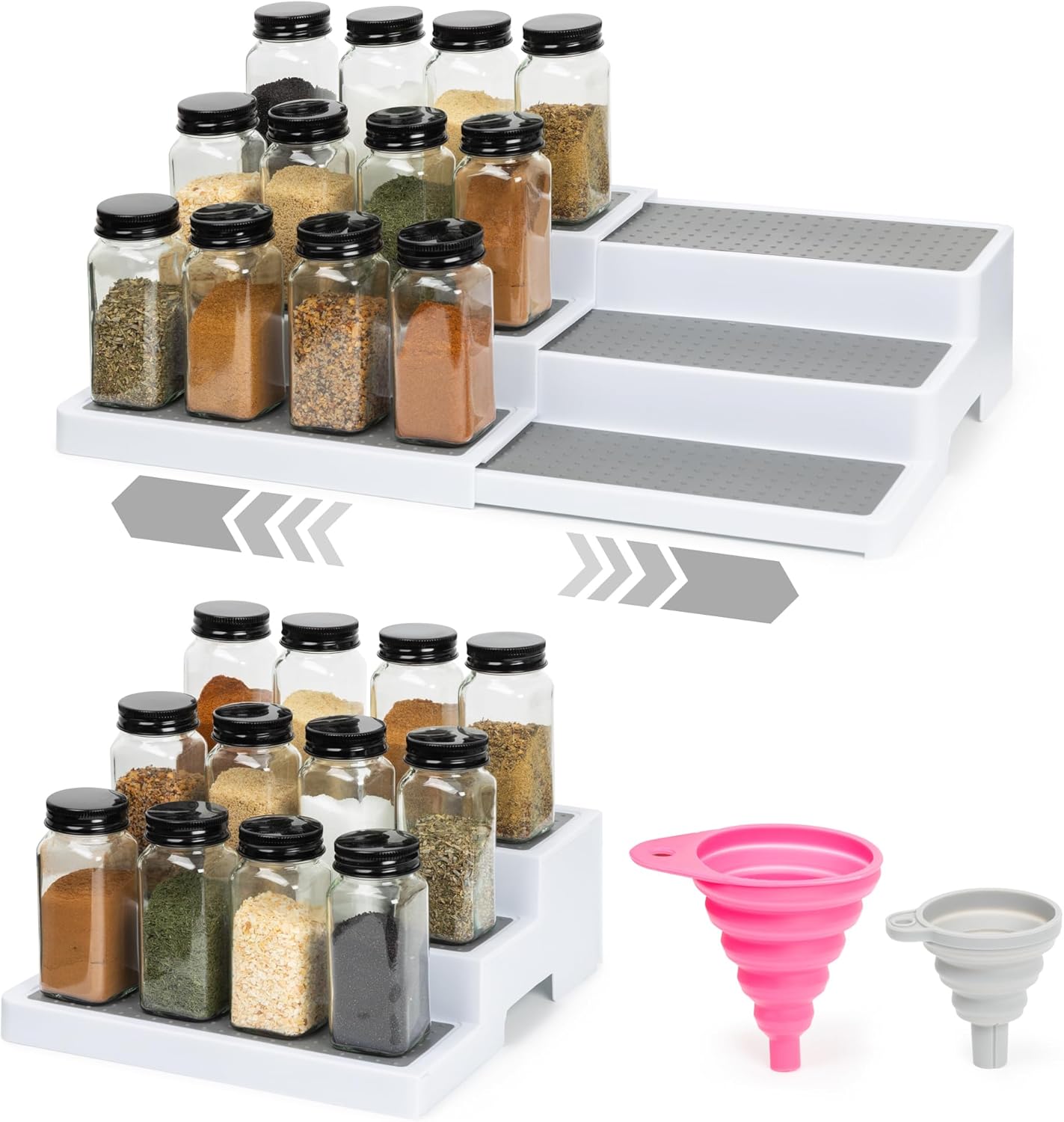 Strong Build with a Protective Non-Slip Base: This expandable spice rack is made from thick plastic that’s easy to wipe clean; The non-slip base will firmly grip your counter, cabinet, or whatever other surface you have it on without damaging it