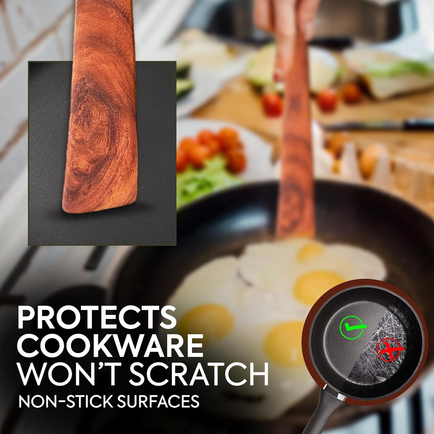 Safe for All Cookware — Cook worry-free with this non-scratch wood spatula, perfect for non-stick, ceramic, and cast iron pans. Its rounded edges protect your cookware’s surface while providing a seamless flipping and stirring experience.