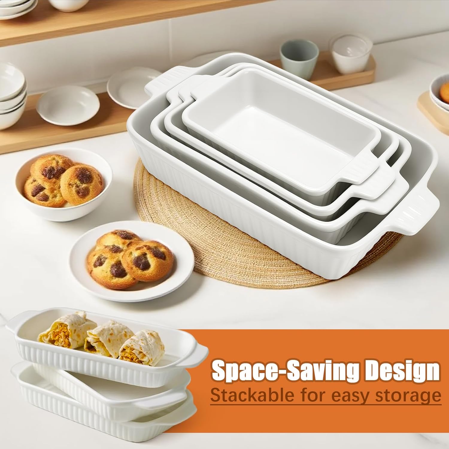 Premium Material: Crafted from lead-free, professional-grade ceramic, this casserole dish set is designed to withstand high temperatures without cracking or warping, and it is safe to use in dishwashers, refrigerators, microwaves, and ovens up to 500°F/260°C, heats evenly, restaurant grade durability, resisting cracks, stains and thermal shock. With a sleek, modern design and elegant white finish, these ceramic bakeware dishes is a charming addition to your kitchen and dining table
