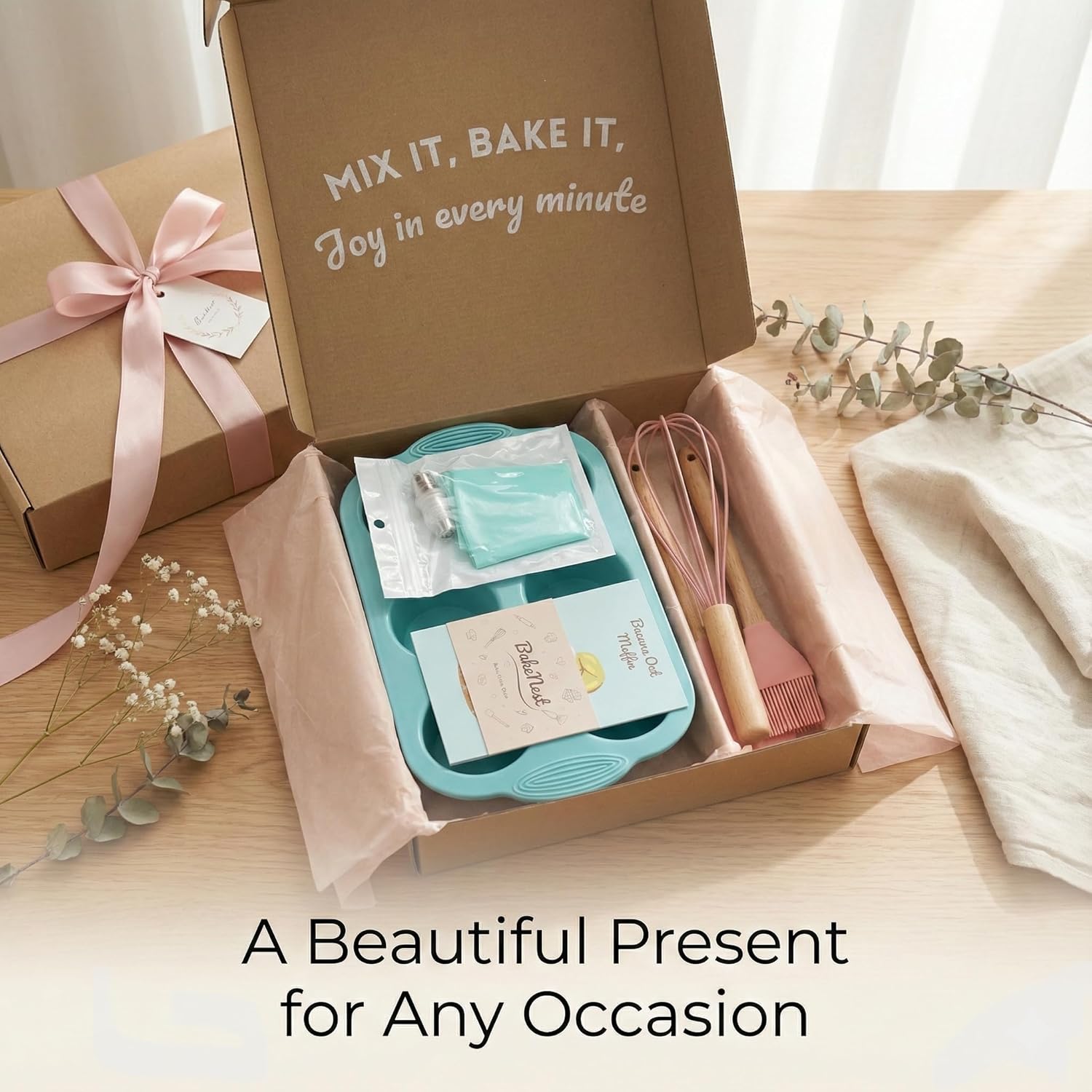 🎂 COMPLETE STARTER SET FOR FAMILY BAKING FUN: This all-in-one baking set includes everything beginners, families, mothers and kids need to bake muffins, cupcakes, cookies, brownies, pies and more. Thoughtfully assembled with silicone pans, kitchen utensils, a piping kit and 5 recipe cards, this starter kit delivers the essential bakeware, tools and cookware supplies to spark confidence and creativity in the kitchen.