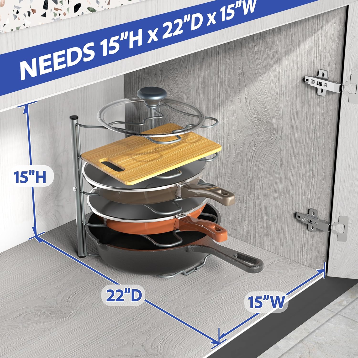 Great pan organizer to save cabinet and countertop space, stores up to 5 pans