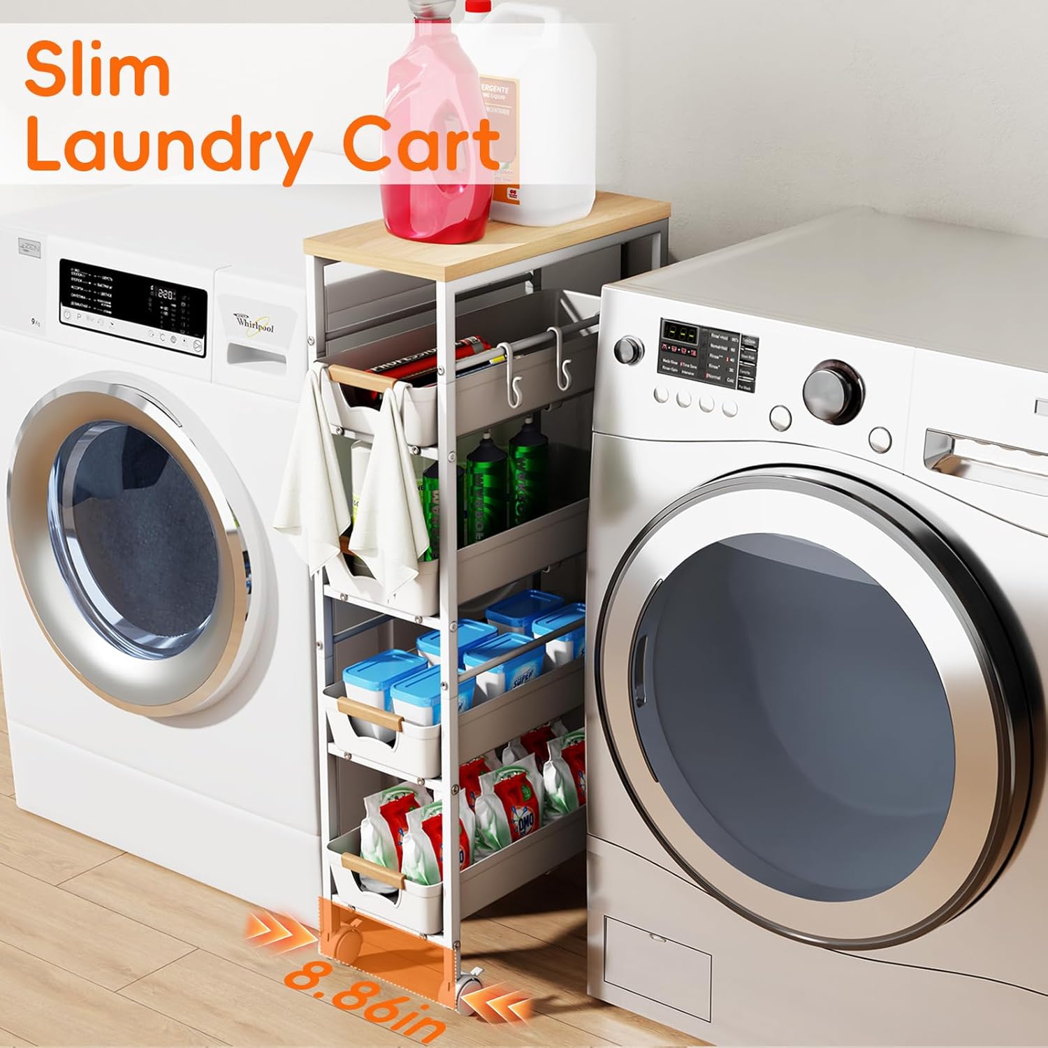 【Compact Design for Narrow Spaces】- Measuring 8.07″ W × 14.37″ D × 32.28″ H, Optimized to slide seamlessly into tight gaps—ideal between kitchen refrigerators & walls, laundry room appliances, or cramped corners. Maximize unused spaces instantly for the slim storage cart.