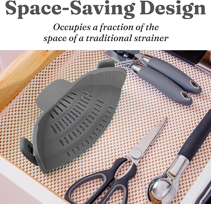 HEAT-RESISTANT SILICONE – Our Snap N’ Strain Pot Strainer is made from high-quality, heat-resistant silicone that can withstand temperatures up to 440°F (230°C). Whether you’re draining hot pasta or boiling vegetables, this silicone clip-on strainer will not warp or melt, ensuring both safety and durability in your kitchen.