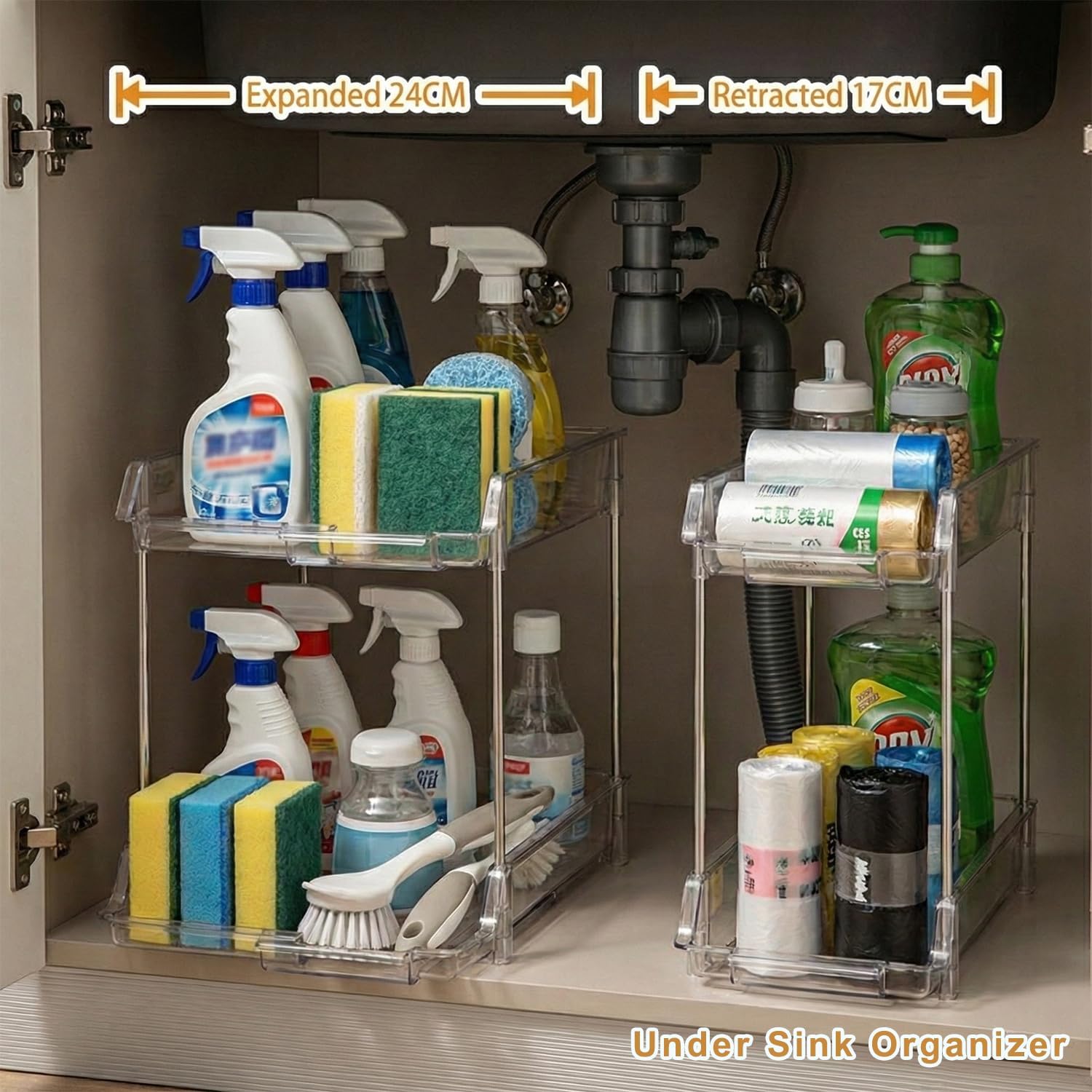 Adjustable Width for Cabinet-Friendly Storage: The 2 tier organizer measures 6.69–9.45″ W × 13.98″ L × 10.83″ H, making it an ideal expandable and adjustable cabinet organizers. The width shifts from 6.69″ to 9.45″ to fit narrow or wider spaces, working perfectly as a spice rack organizer or a compact kitchen shelf organizer.