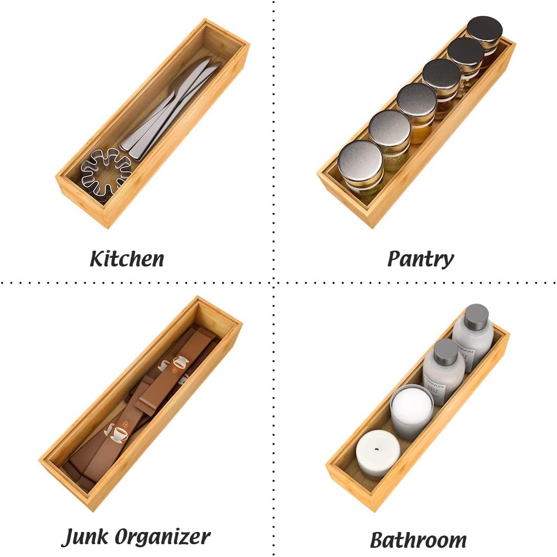 【Perfect Sizes & Stackable Design】Stackable drawer dividers fits anywhere to fit your specific needs with its different sizes. Our wood utensil organizer suitable for small or large kitchen utensils, silverware, cutlery and flatware. As bathroom drawer organizers can be stacked to save more you space, especially when organizing desk, bathroom countertop to keep perfume, candle, jewelry, trinket, watch etc.