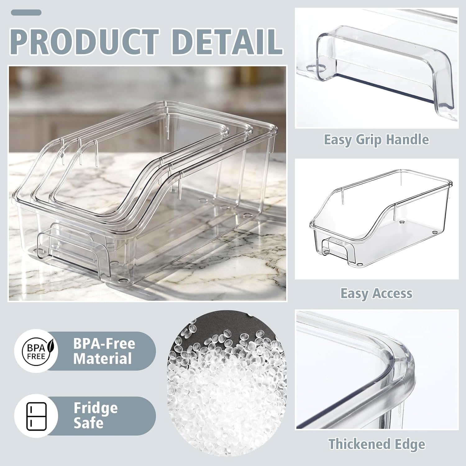 Easy to Clean and Space-saving: these transparent storage baskets can be hand-washed with soap and water and then air-dried; The stackable design saves space; Simply stack them together when not in use, saving valuable space