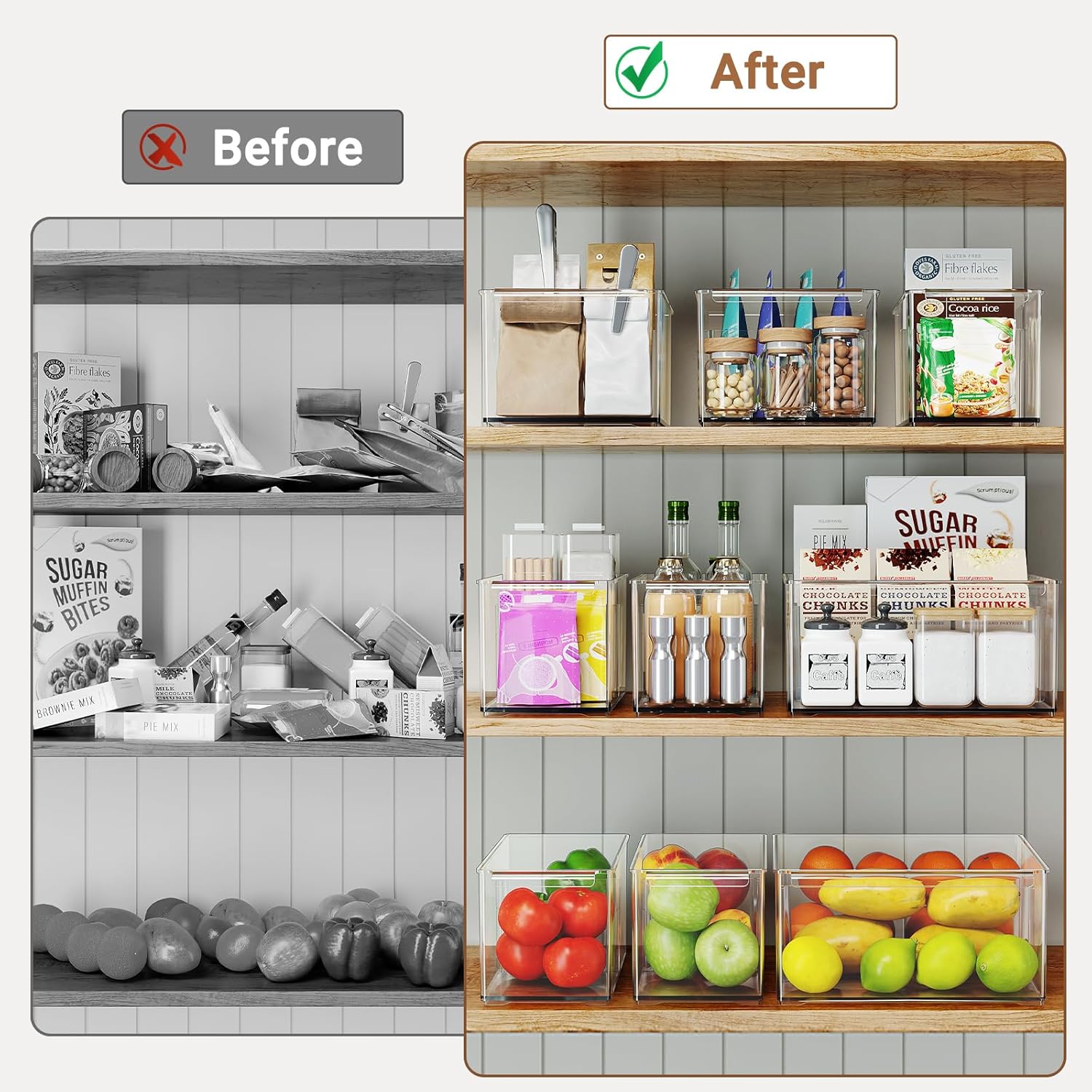 Easy-Clean & Aesthetic Storage Bin: The sturdy pantry storage containers Crafted from smooth, non-porous PET plastic while allowing quick wiping. The temperature range is -20°~ 105°F, please DO NOT put it in the DISHWASHER !Its minimalist transparent design blends seamlessly into any modern kitchen, fridge, pantry, snack, bathroom, or closet, keeping spaces tidy and visually light. Practical and beautiful, it simplifies maintenance while elevating your home organization.