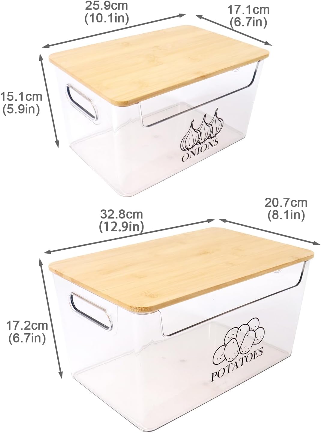 Easy to Use: The produce storage box for pantry features a spacious wide opening, making it convenient to place and acces potatoes and onions. Equipped with side handles for easy movement. Wooden lid is sturdy enough to serve as a storage board.