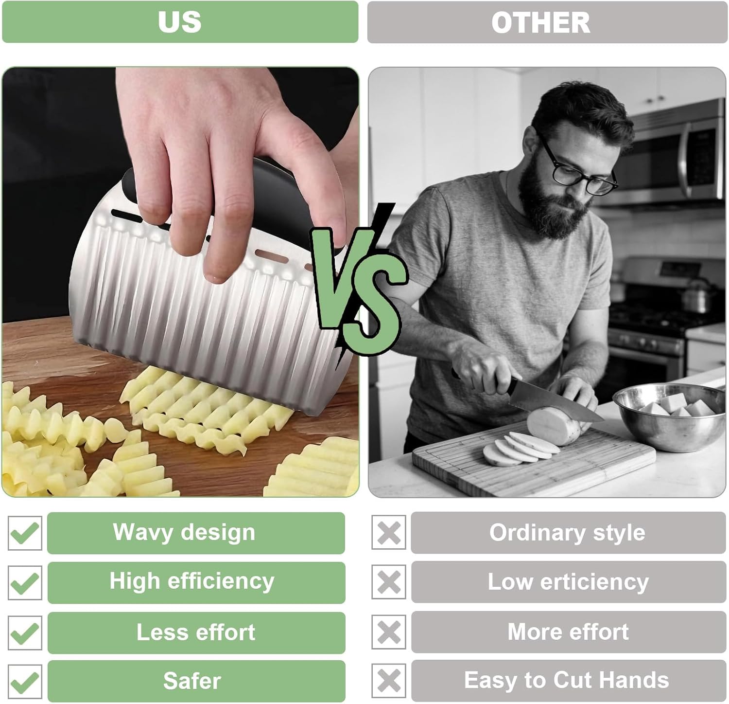 【Wavy Slices, Adding Color and Fun to Dishes】 crinkle cutter for veggies Easily make wavy fries, fancy salads, and creative side dishes. The one-piece molded stainless steel blade is sharp and durable, capable of handling a variety of fruits and vegetables, transforming everyday dishes into restaurant-quality presentations and adding fun to dining