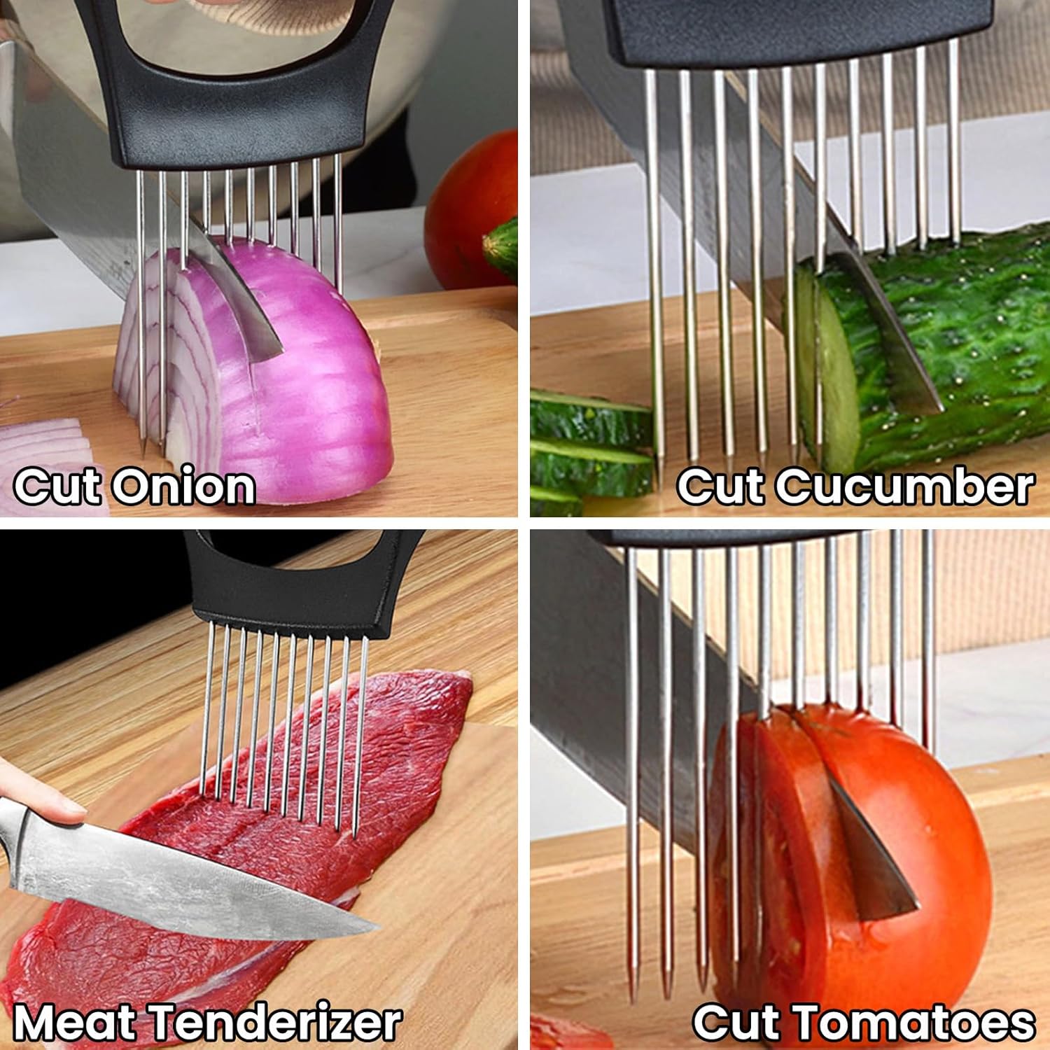 ✅VERSATILE KITCHEN GADGET: Not just for onions, this slicer can be used for various fruits, vegetables and meats. The long sharp steel forks design allows it to be used as a meat tenderizer as well.