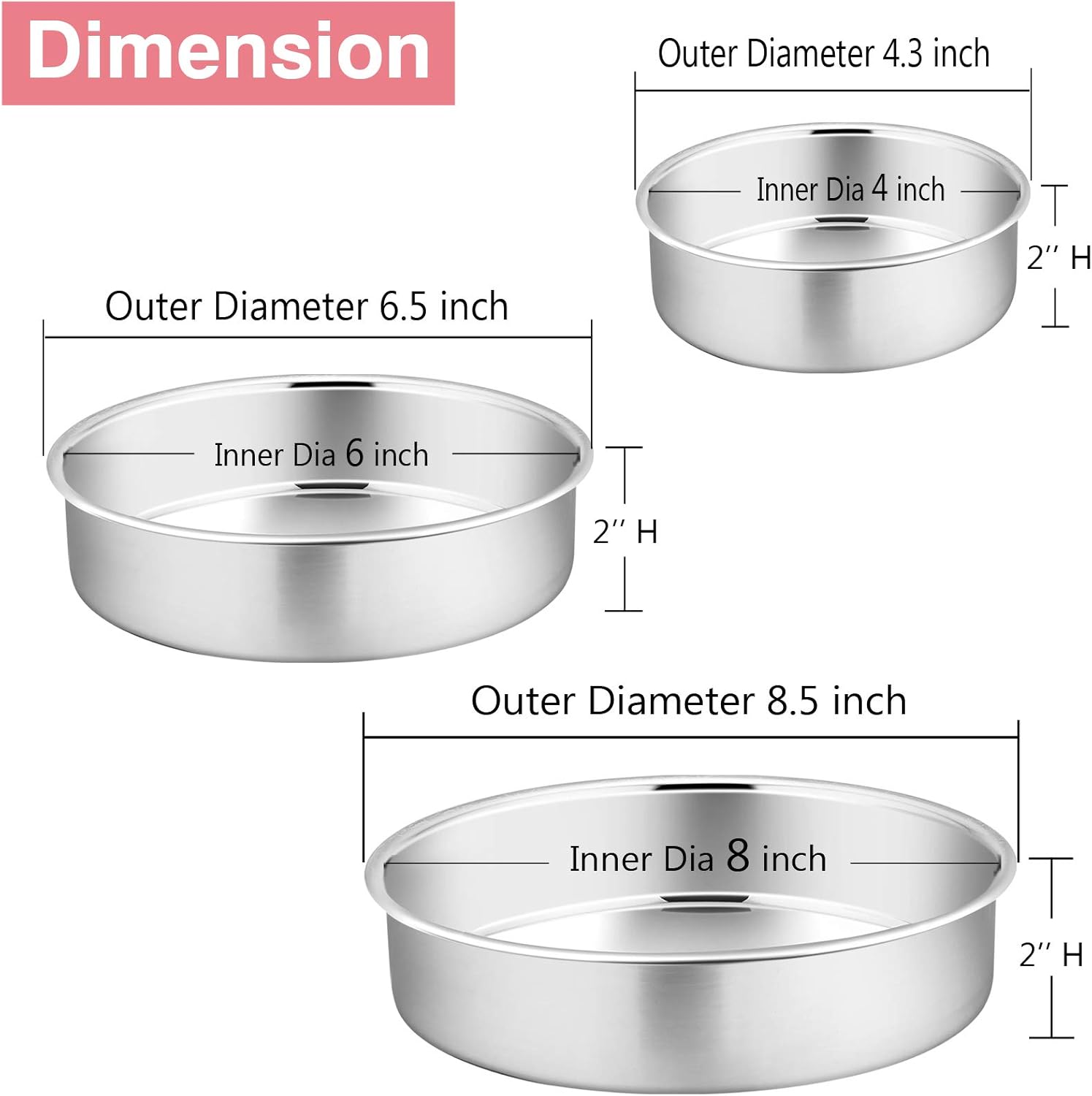 MULTI USE – 3 SIZE- Dia. 4’’, 6’’, 8’’, Height 2’’, The smaller pan perfect to make flan, mini quiche, tartlets,The larger pan great to create pizza, birthday cake, brownie, Use 3 pans together to make beautiful 3 layer cakes for birthday party, housewarming, wedding, A good choice for serving fruits and steaming vegetables