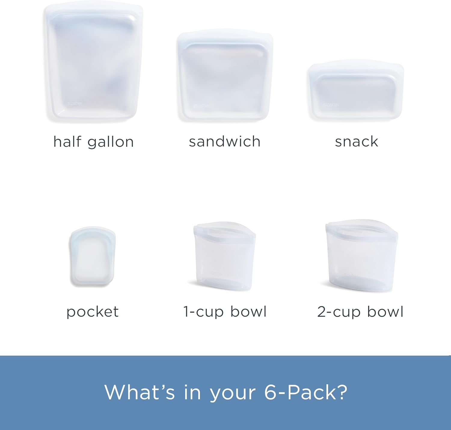 CONTAINS: 6 Stasher Reusable Silicone Bags in the color Clear. Includes 1 Cup (8 Fl Oz) and 2 Cup (16 Fl Oz) Bowls, 1 Pocket (4 Fl Oz), 1 Half Gallon (64 Fl Oz), 1 Sandwich (28 Fl Oz), and 1 Snack (12 Fl Oz) Bags.