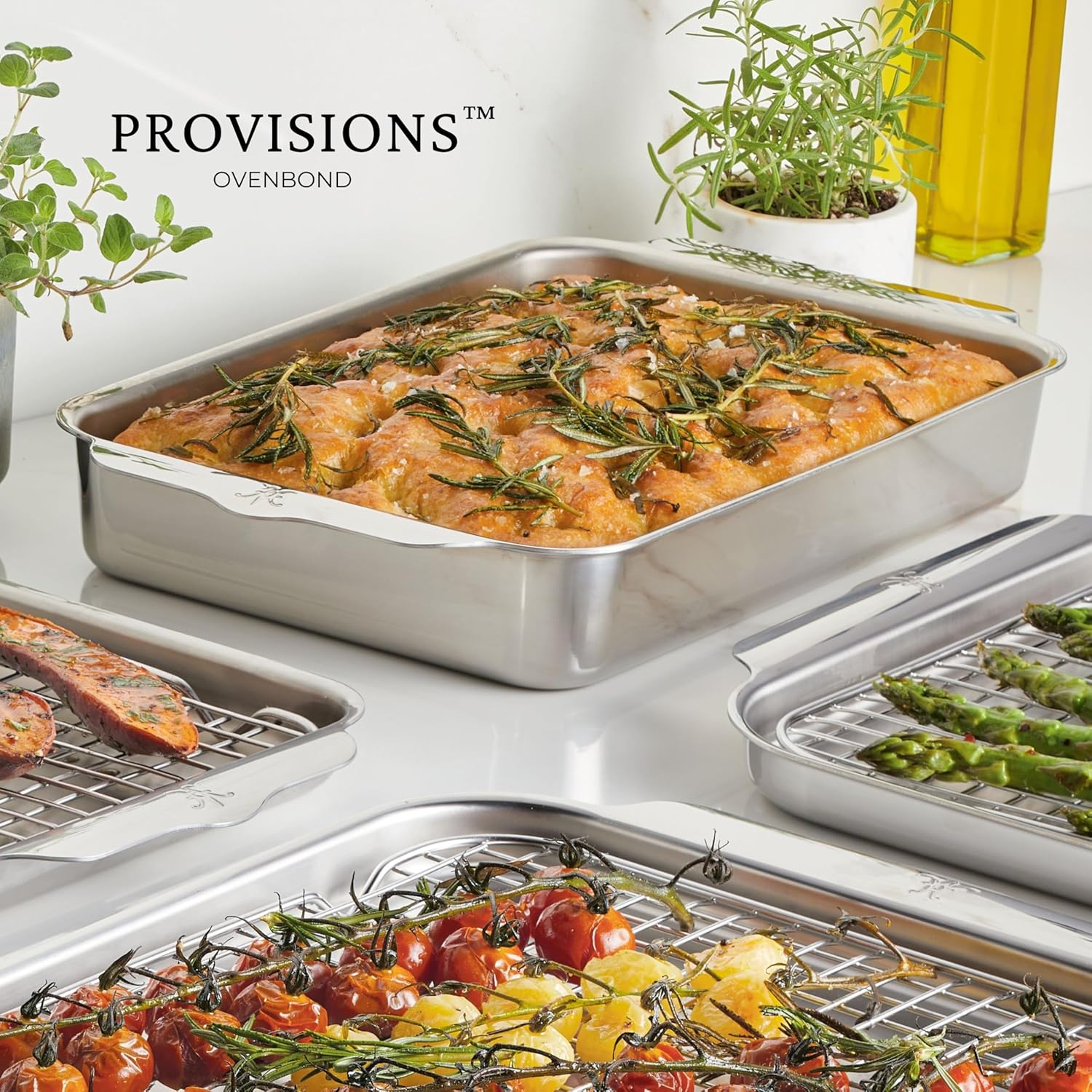 Bakeware pan with exceptional heat conductivity is broiler and oven safe to 600°F to accommodate a wide range of baking and oven-roasting needs