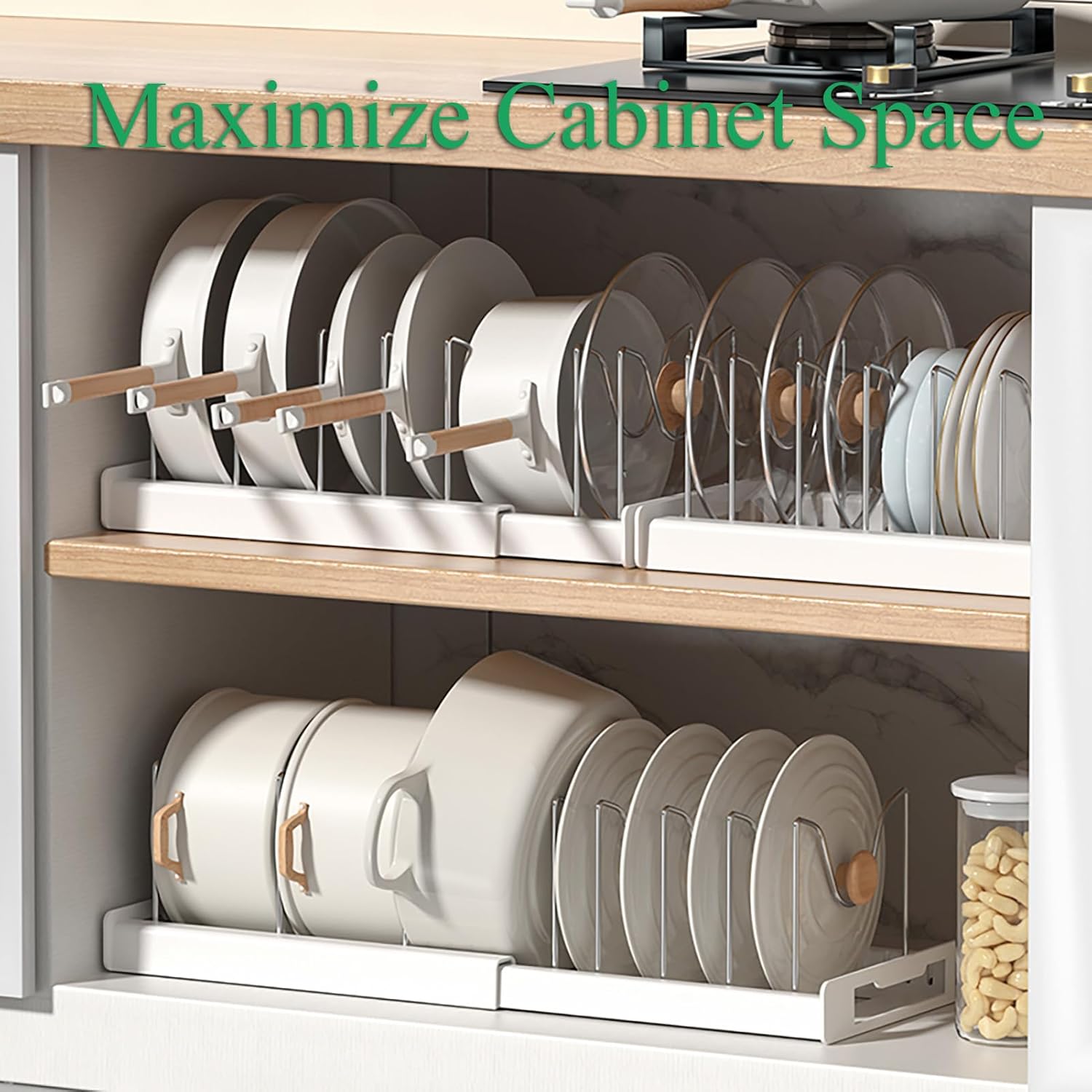 Pot organizers inside cabinet with 7 removable and adjustable compartment can be adjusted freely as you need