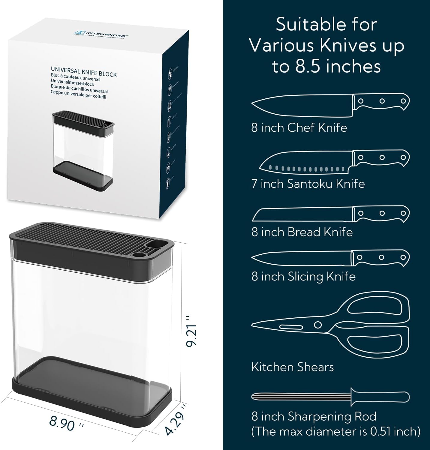 Suitable For All Kinds Of Knives. Feel frustrated with too many different knives that cannot fit into the traditional knife blocks? Our universal knife holder can store any knife up to 8.5 inch(blade thickness ≤ 2.5mm) with any blade shapes. Knives are not included