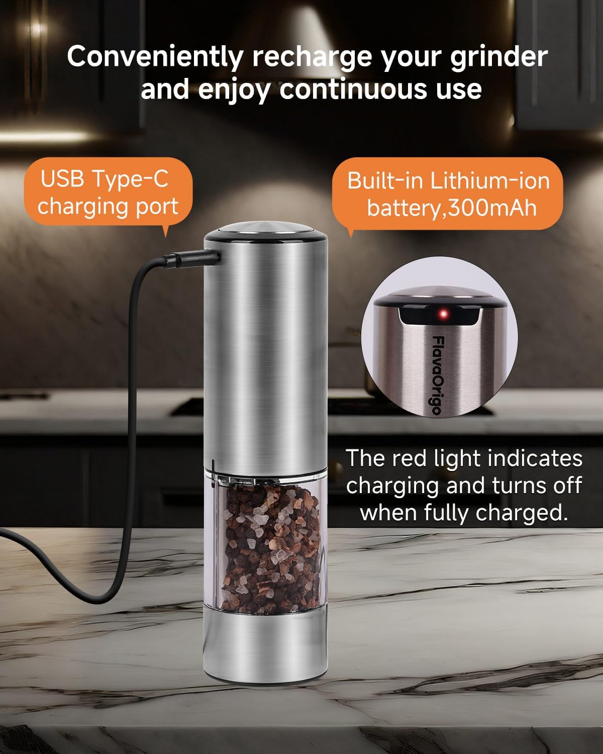 Goodbye Battery Bases, Hello USB-C Freedom! Forget bulky, failure-prone charging docks. Our electric grinders feature direct USB-C charging – just like your phone! A single full charge fuels 300+ uses, keeping you grinding from kitchen to BBQ, hassle-free.