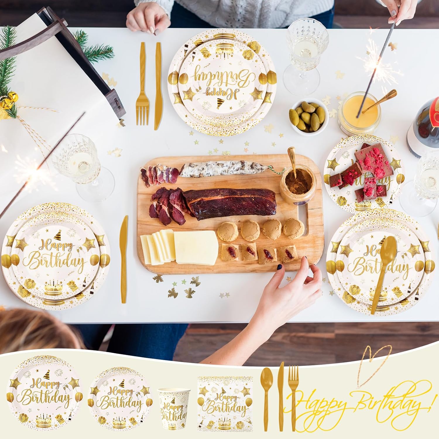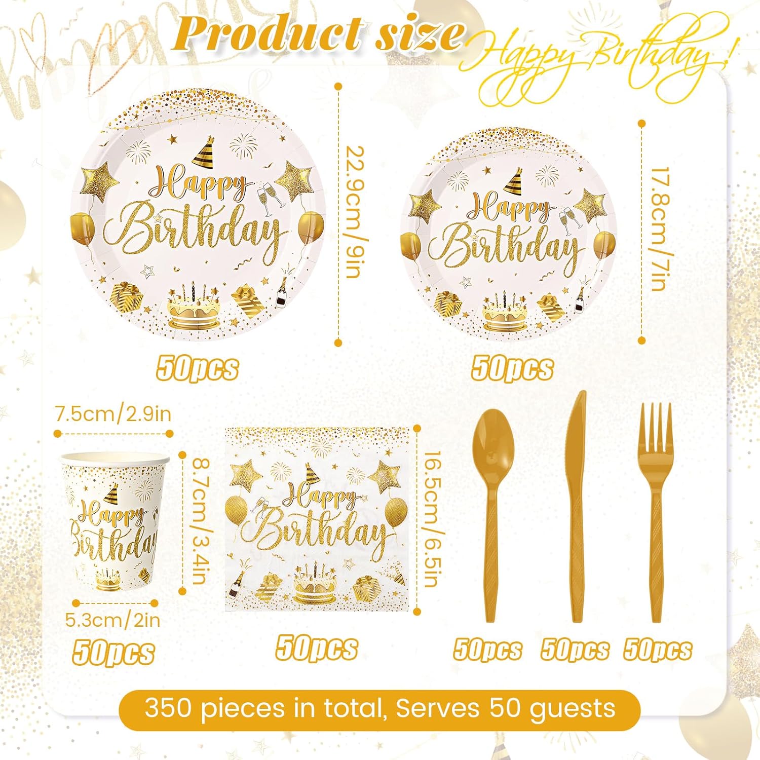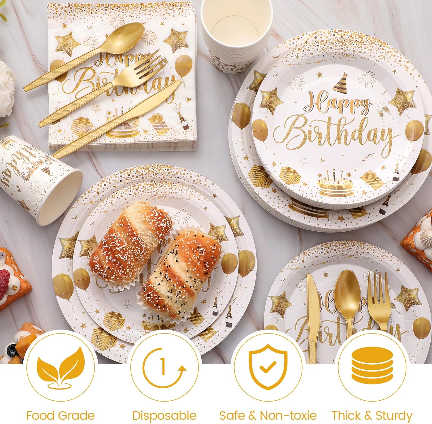 Quality Material: our white and gold birthday plates, cups, and napkins are all made of quality paper to ensure that it doesn’t tear easily when using, sturdy enough to leave a comfortable dining experience for you; The included cutlery is made of quality plastic material, ensuring safety and practical use during the event
