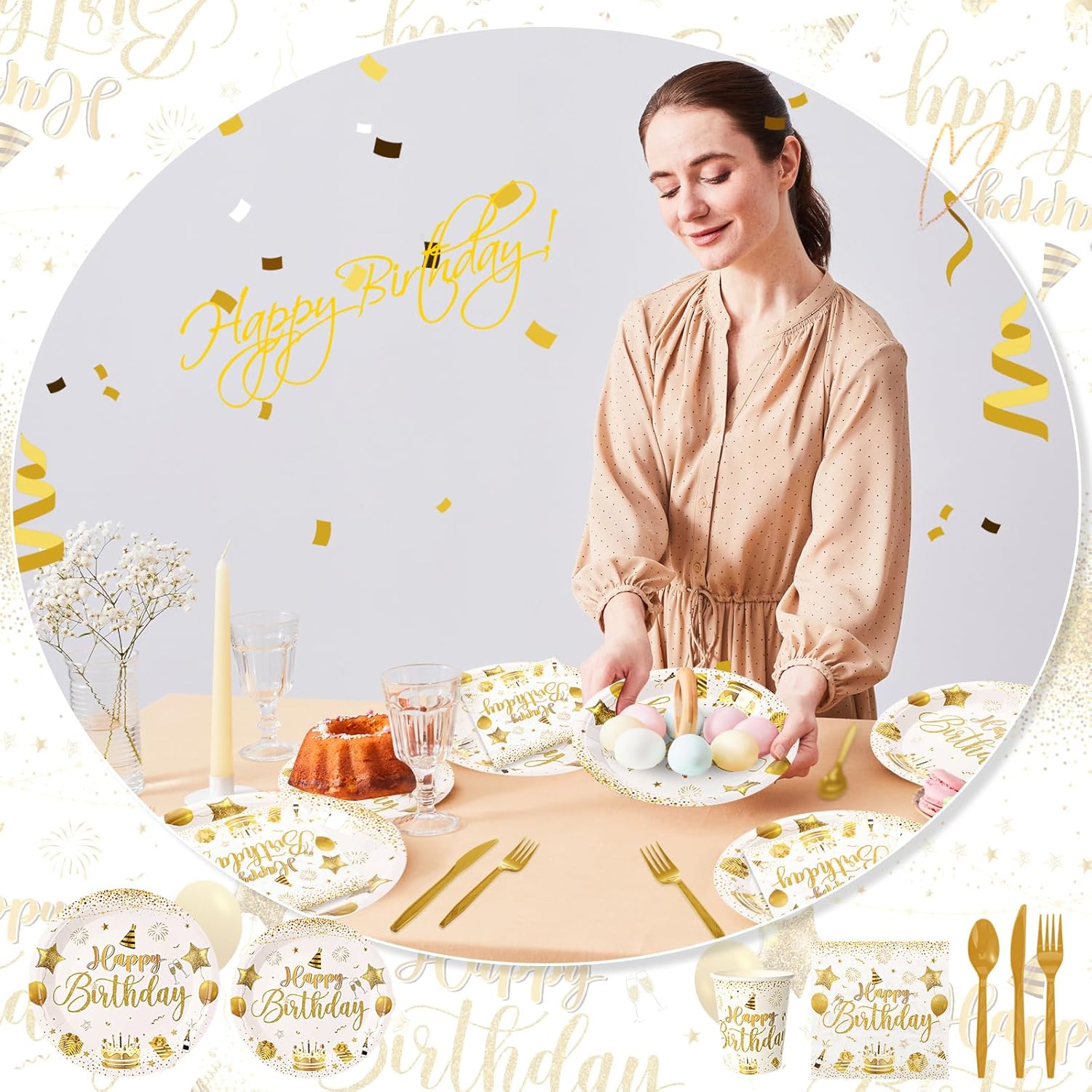 Eye Catching Design: this birthday decorations set designed in white and gold color, features classical birthday cakes, confetti, balloons, presents, and ‘Happy Birthday’ words; Decorating your birthday party with this white and gold tableware kit can make your party full of the festival atmosphere