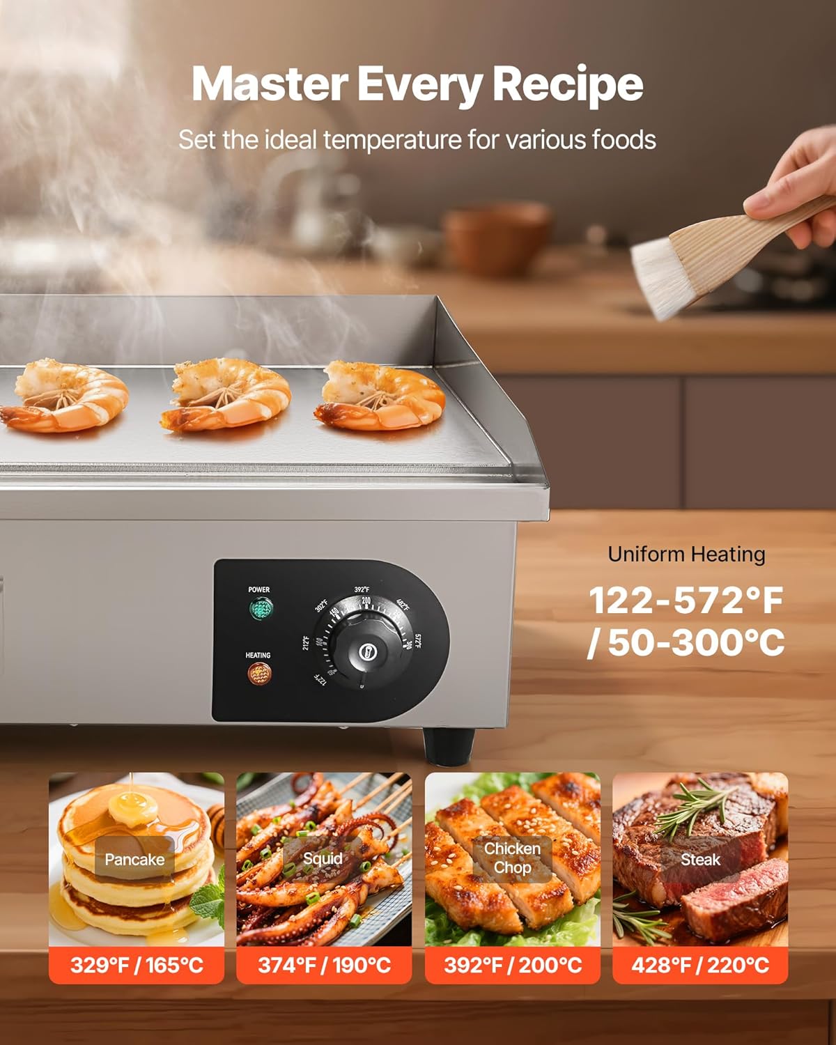 Precise Heating Control: Adjustable temperature from 122°F–570°F / 50°C–300°C, this stainless steel electric griddle lets you master the ideal heat for pancakes, steaks, chicken, and more