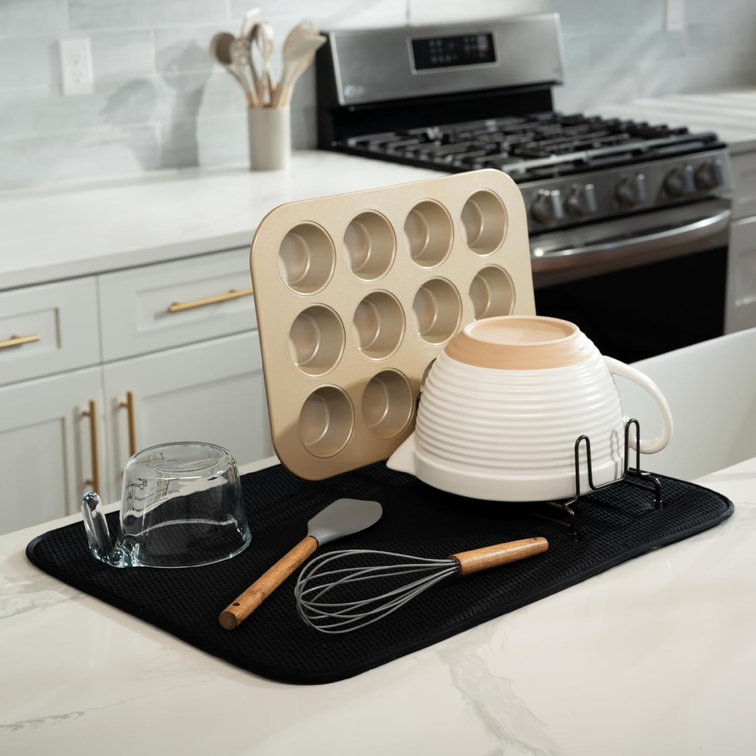 Dish drying mat for kitchen counter protects surfaces from scratches and scuffs when placed under kitchen gadgets; multipurpose drying pads can be used as an appliance slider for a mixer or blender