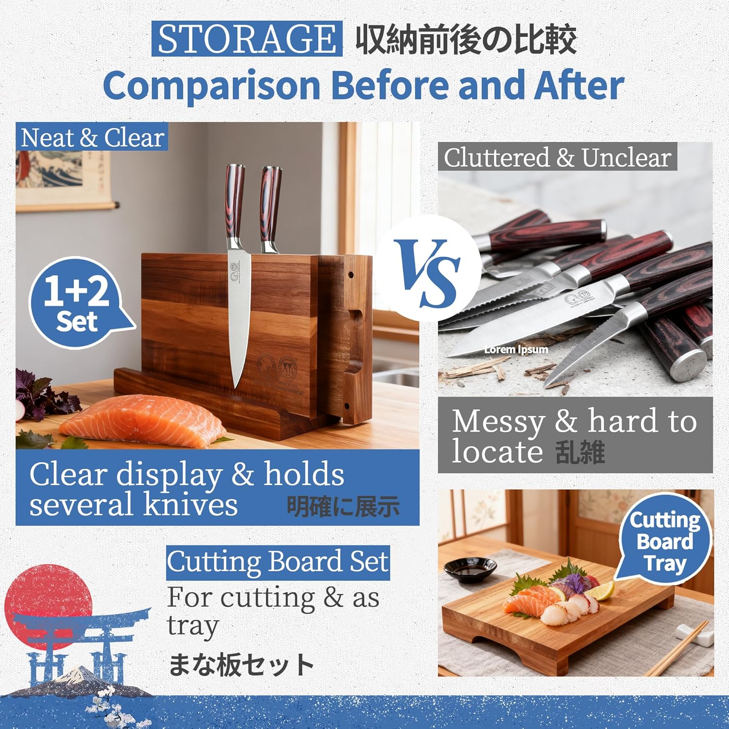 【Premium Acacia Wood Craftsmanship】Handcrafted from sustainably sourced acacia wood, this 3-piece set (1 magnetic knife block + 2 reversible cutting boards) showcases beautiful natural grain and durable construction. Resistant to moisture and wear, it’s perfect for daily kitchen use while adding a touch of rustic elegance.
