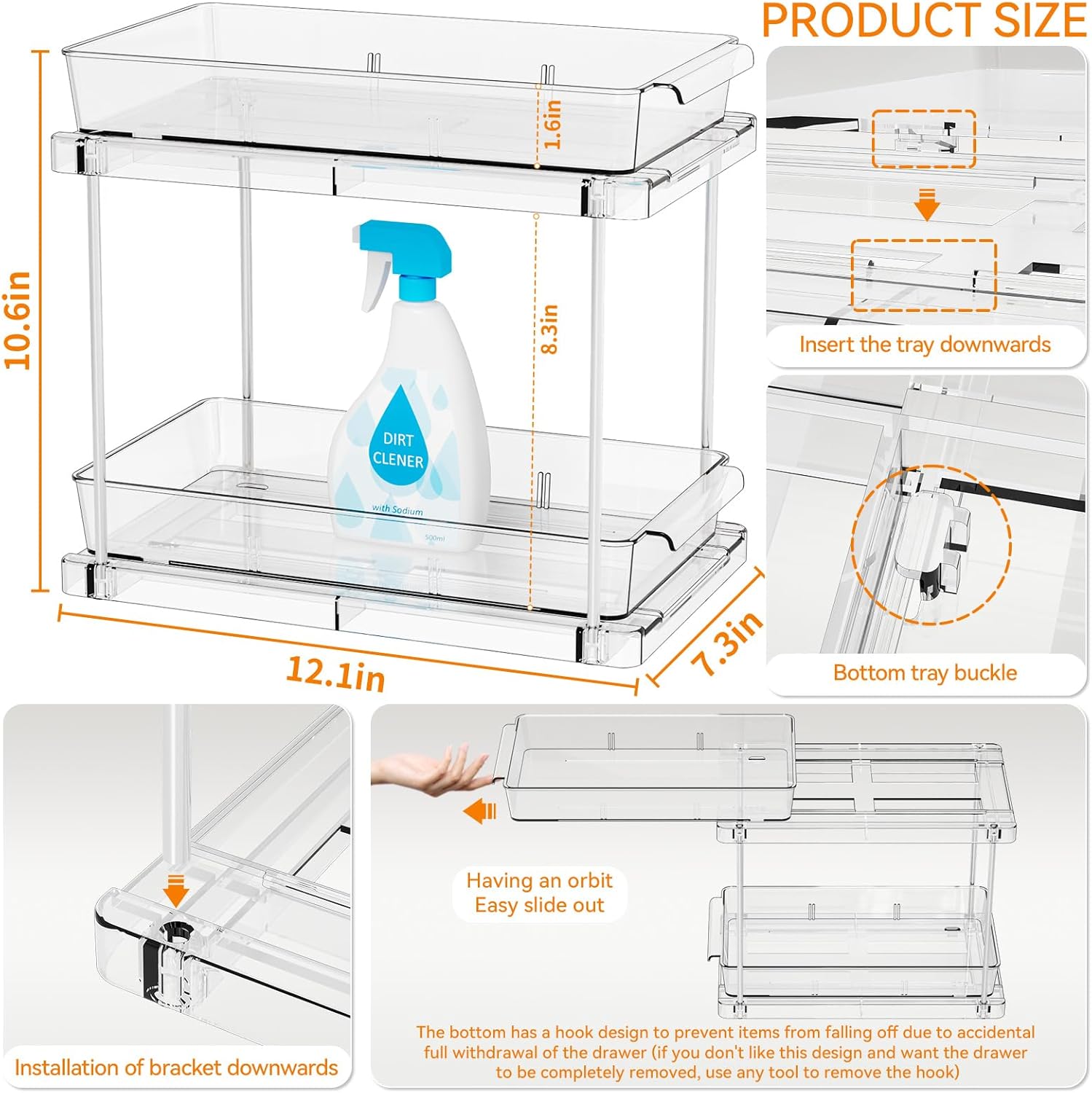 【Durable and Versatile】the under counter organizer transparent design allows you to easily find what you need. Saving time and keeping everything organized,which is both practical and beautiful,Very suitable as pull out drawers pantry organizers and storage,pull out cabinet organizer drawers,bathroom vanity storage,undersink storage organizers,bathroom sink storage,cabinet organization for kitchen,drawer shelf